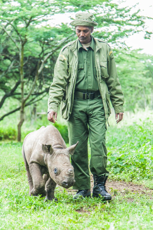 Bebé rinoceronte con su cuidador